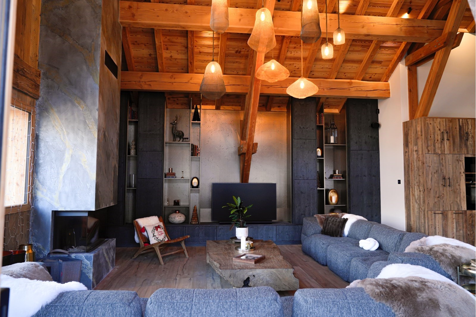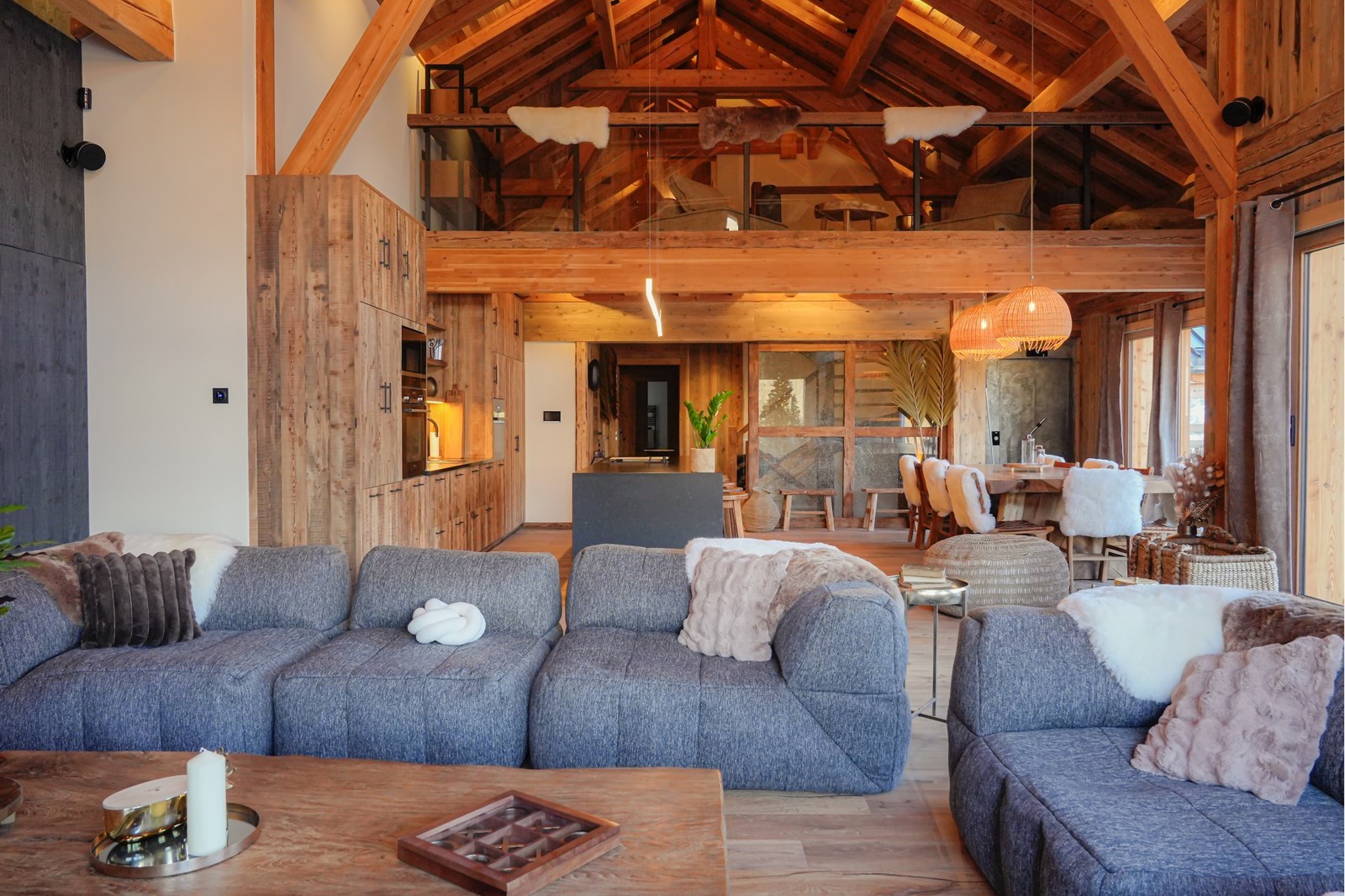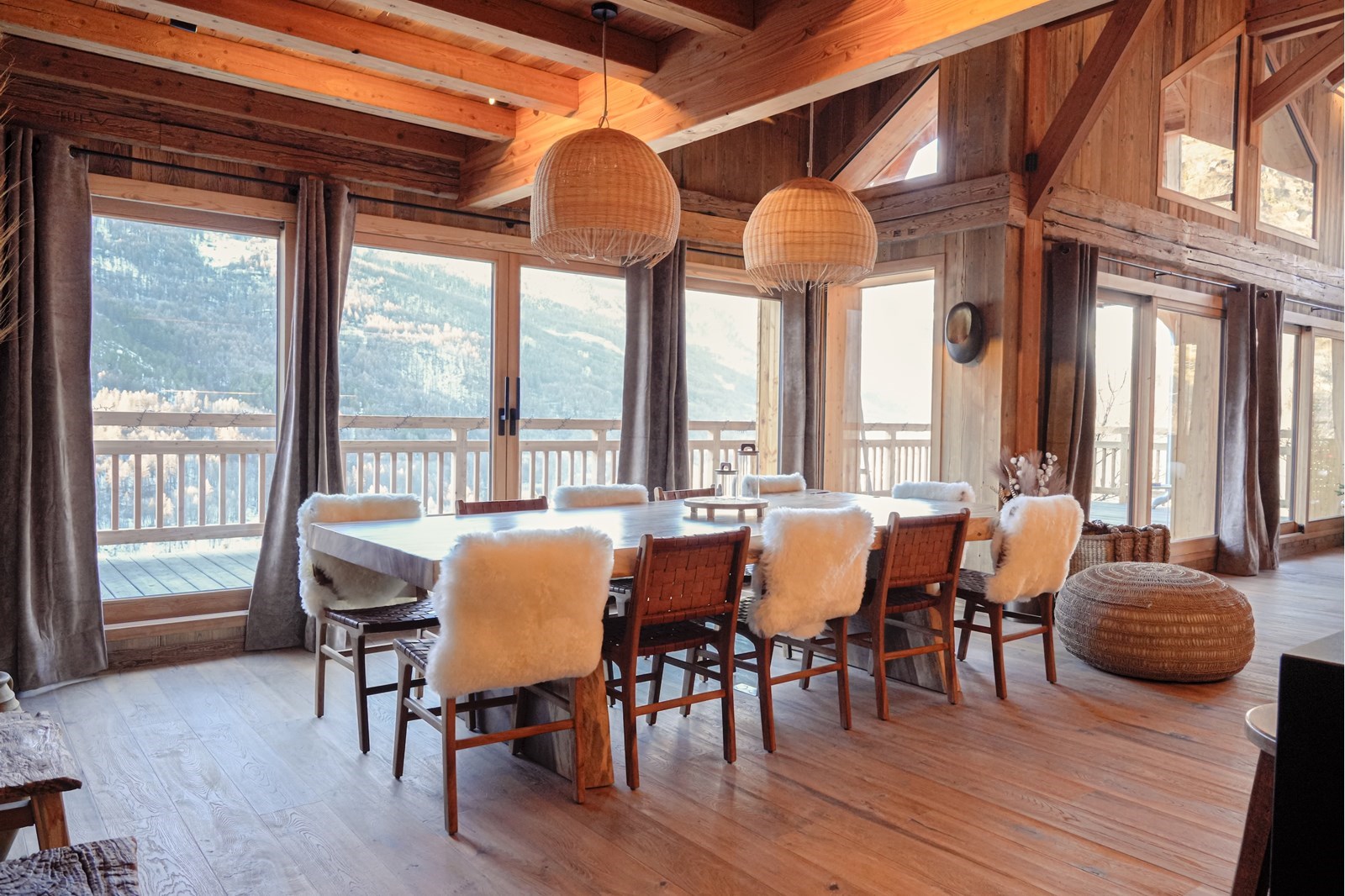 Sous une charpente culminant à plus de 5 mètres, cet espace majestueux devient le cœur battant du chalet. Famille ou amis, c'est dans cette cathédrale de bois que naissent les moments de partage inoubliables.