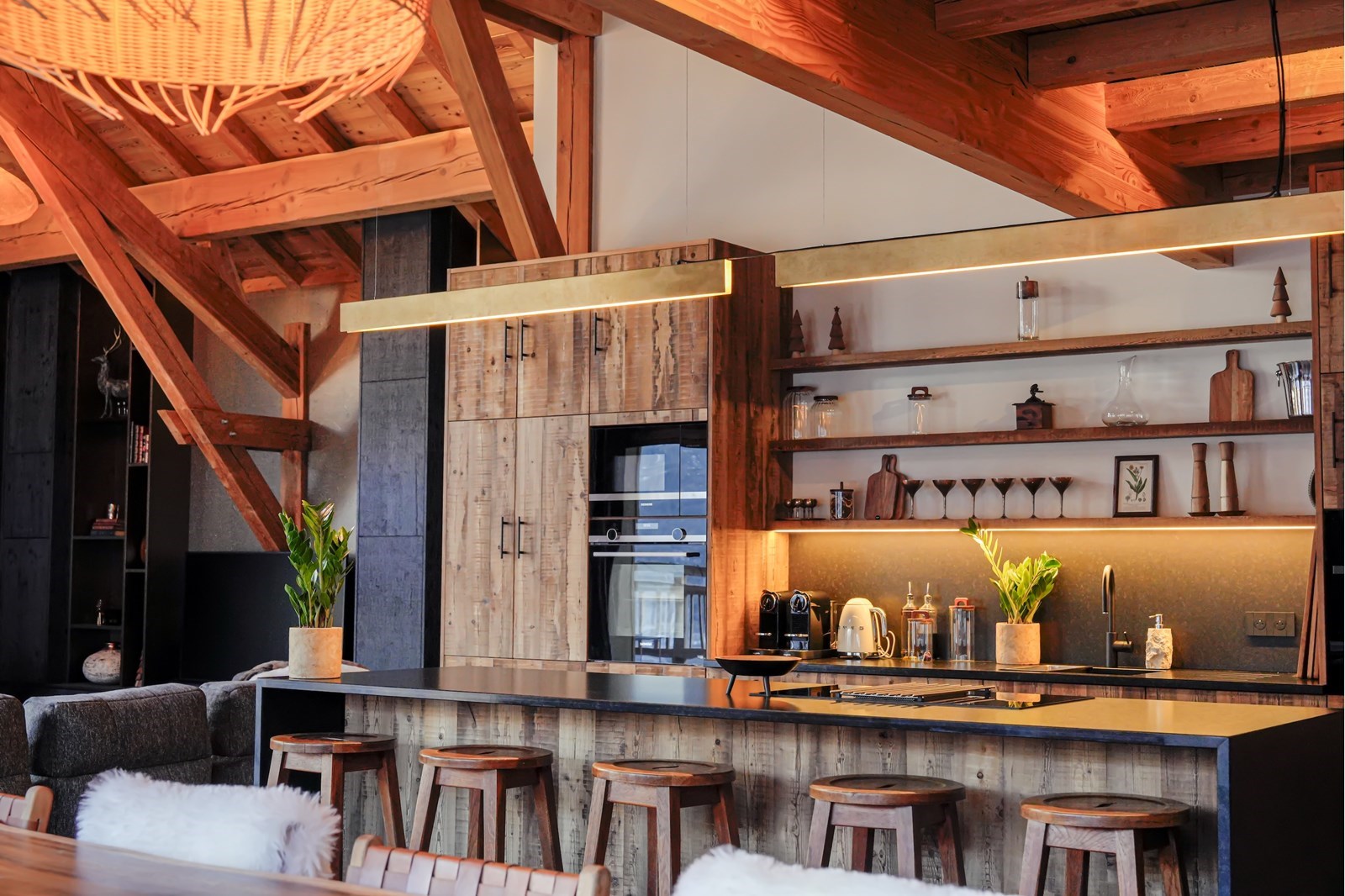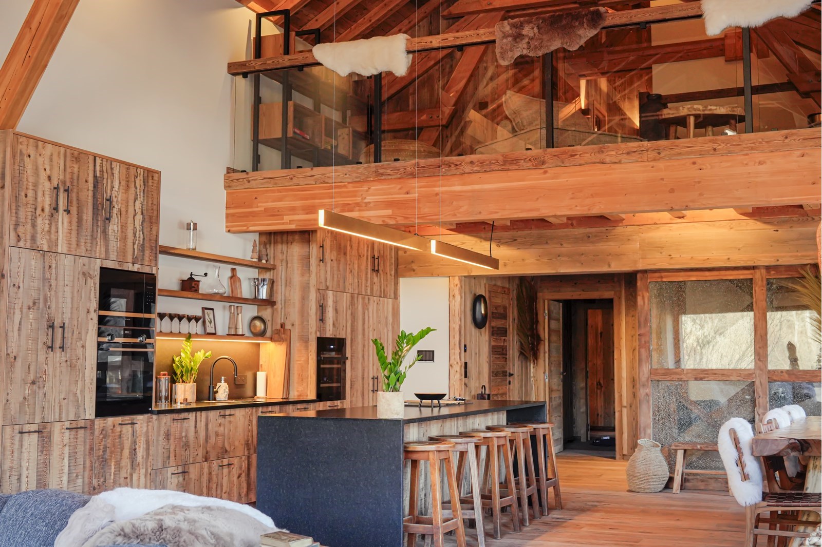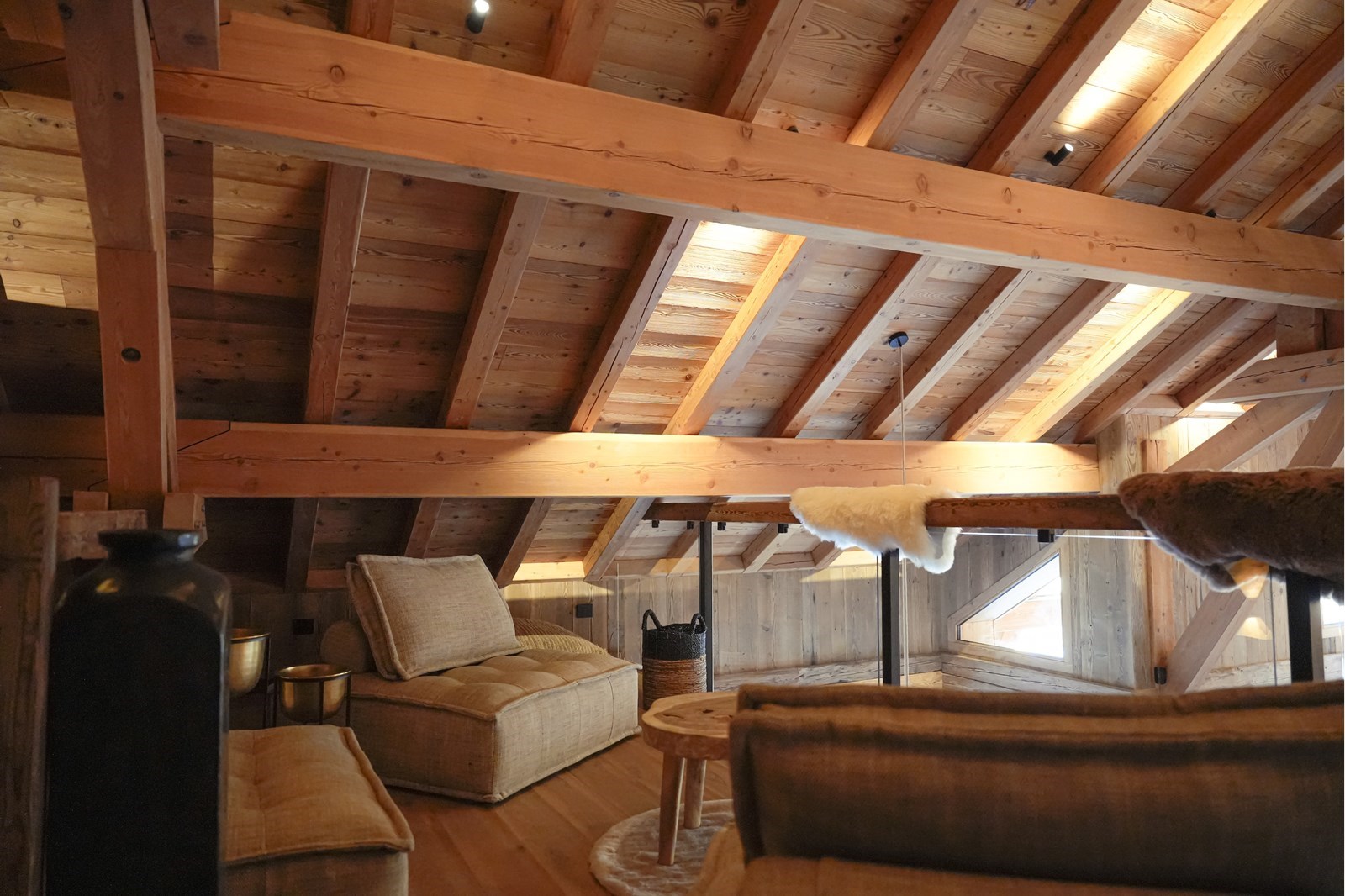 Sous une charpente culminant à plus de 5 mètres, cet espace majestueux devient le cœur battant du chalet. Famille ou amis, c'est dans cette cathédrale de bois que naissent les moments de partage inoubliables.