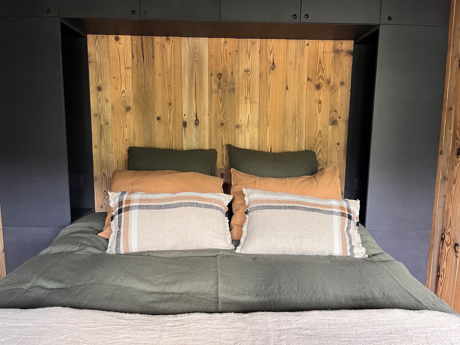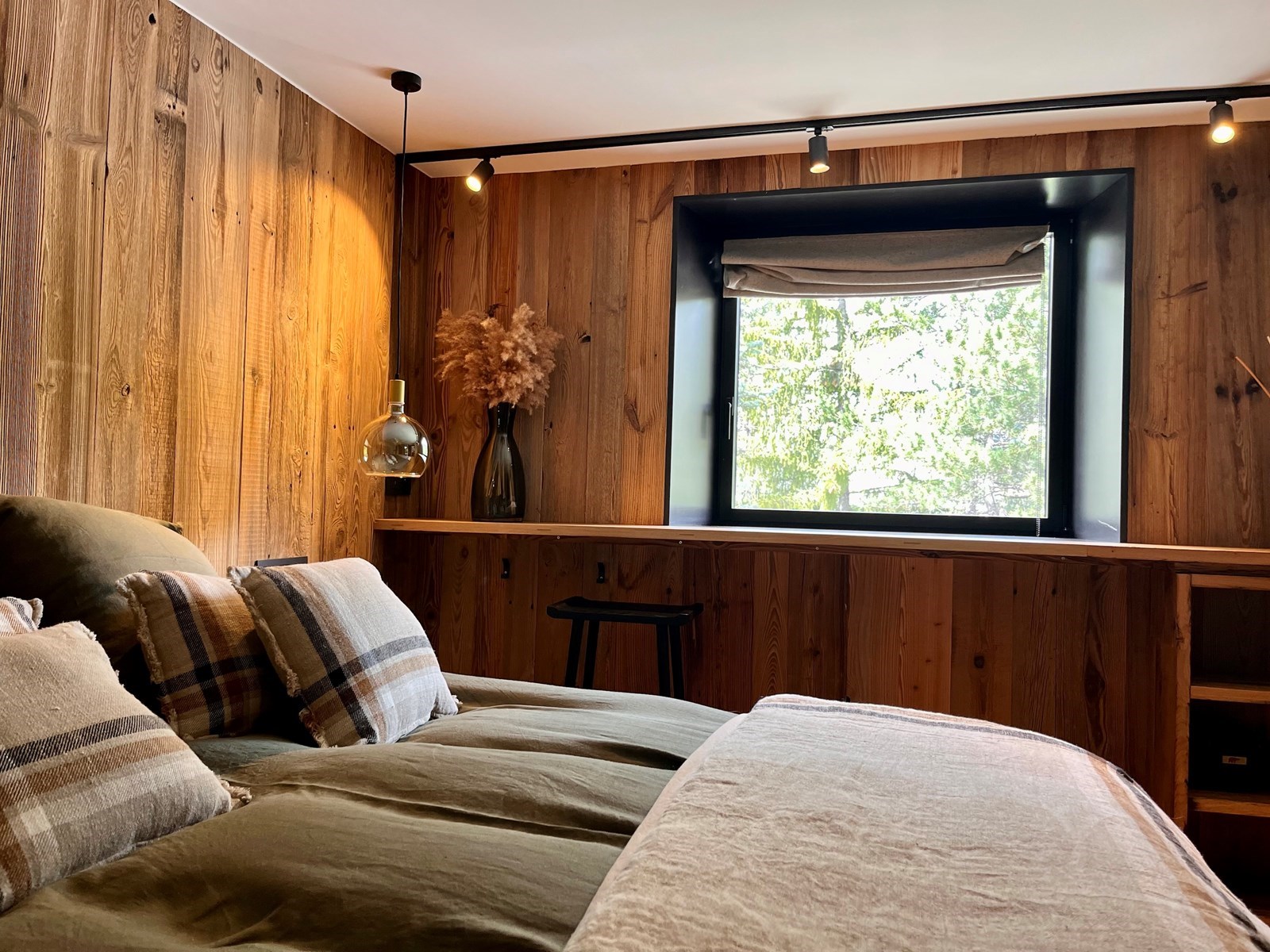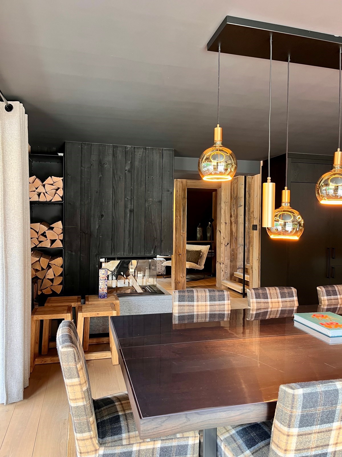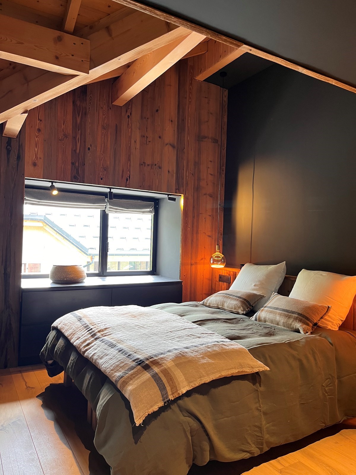 Bois brut, pierre brute, bois noir, tissus épais, teintes discrètes... L'influence nordique se diffuse par touches subtiles pour donner au chalet Björn un caractère résolument unique.