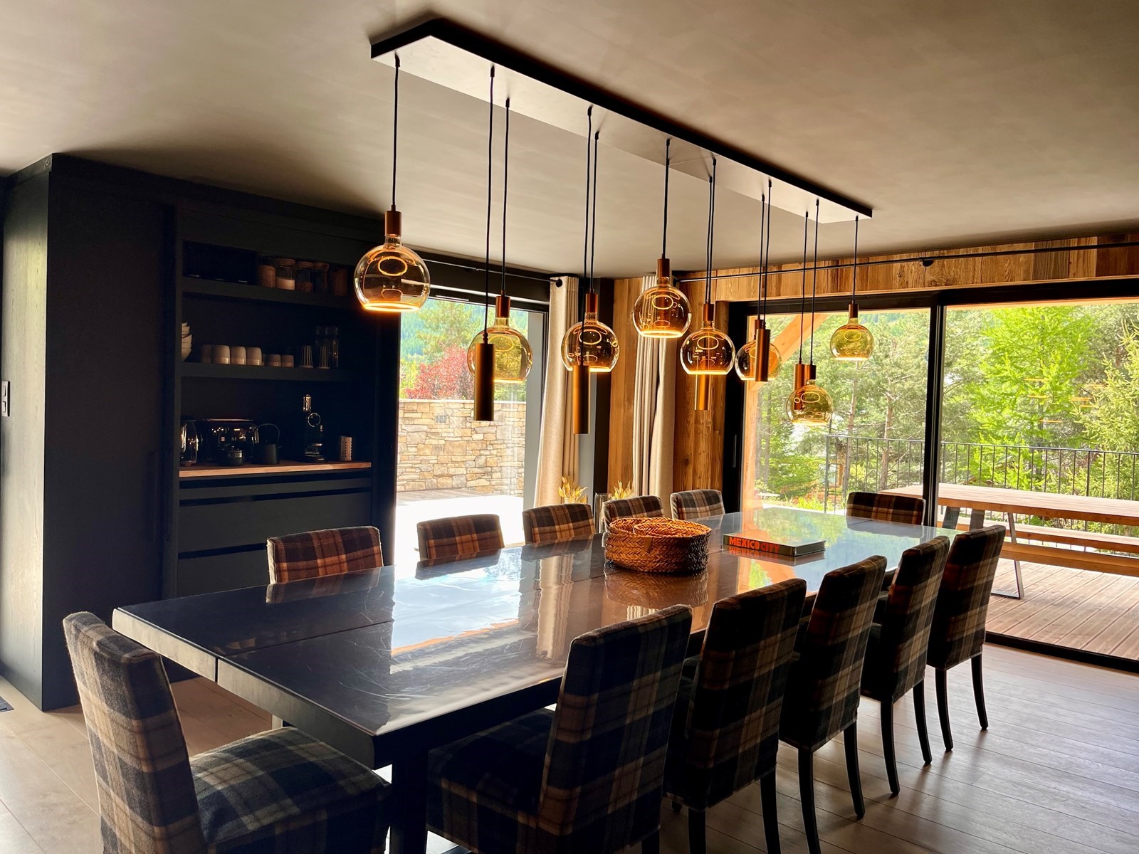 Salle à manger et cuisine ouverte - Salon avec cheminée - Toilettes - Terrasse avec table, spa extérieur et brasero