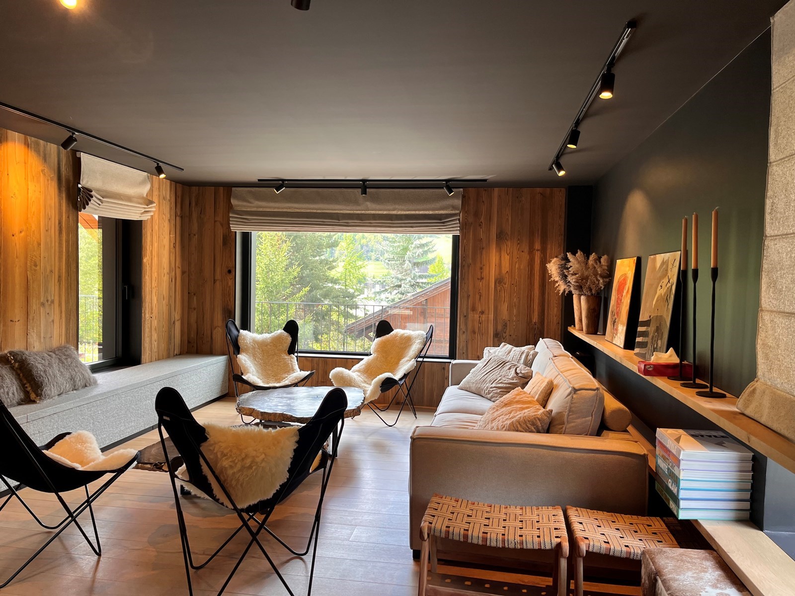 Le chalet se dévoile face aux sommets, parfait cocon de confort d'où l'on embrasse le spectacle des skieurs. La montagne comme tableau vivant.