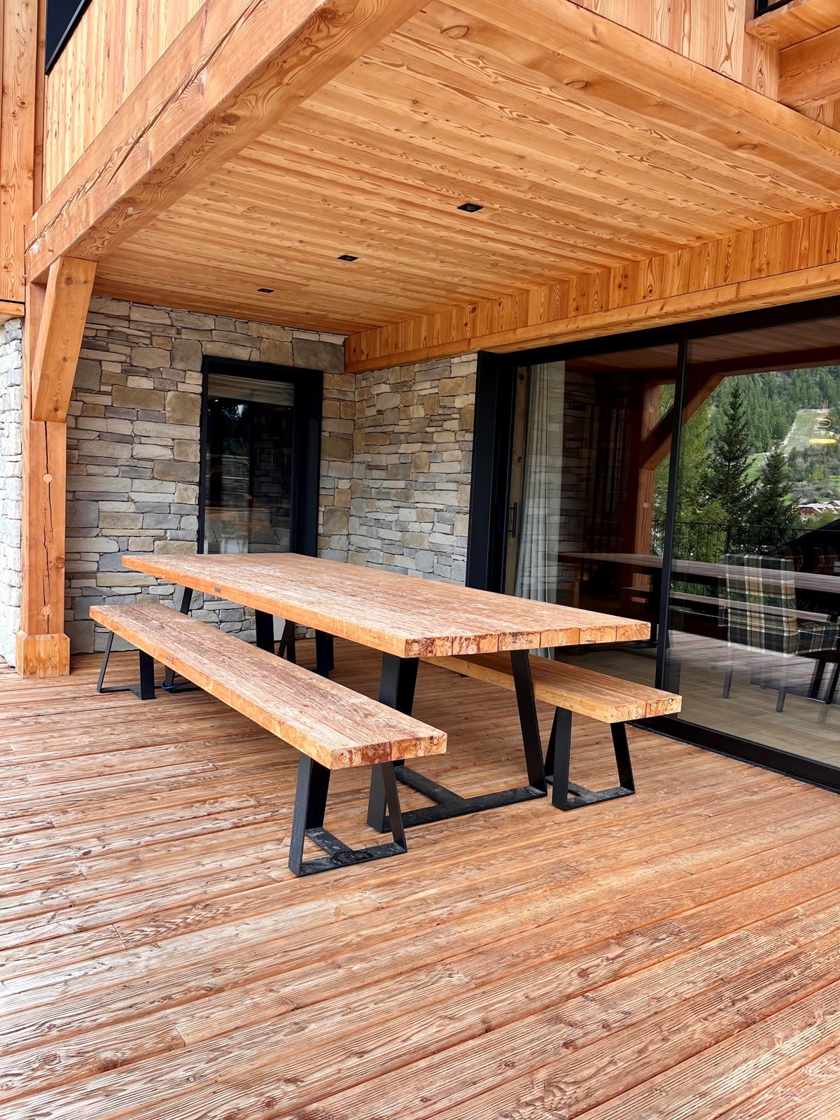 Sur la terrasse, il devient le point de ralliement des soirées qui s'étirent. Flammes dansantes, conversations infinies, montagne étoilée.