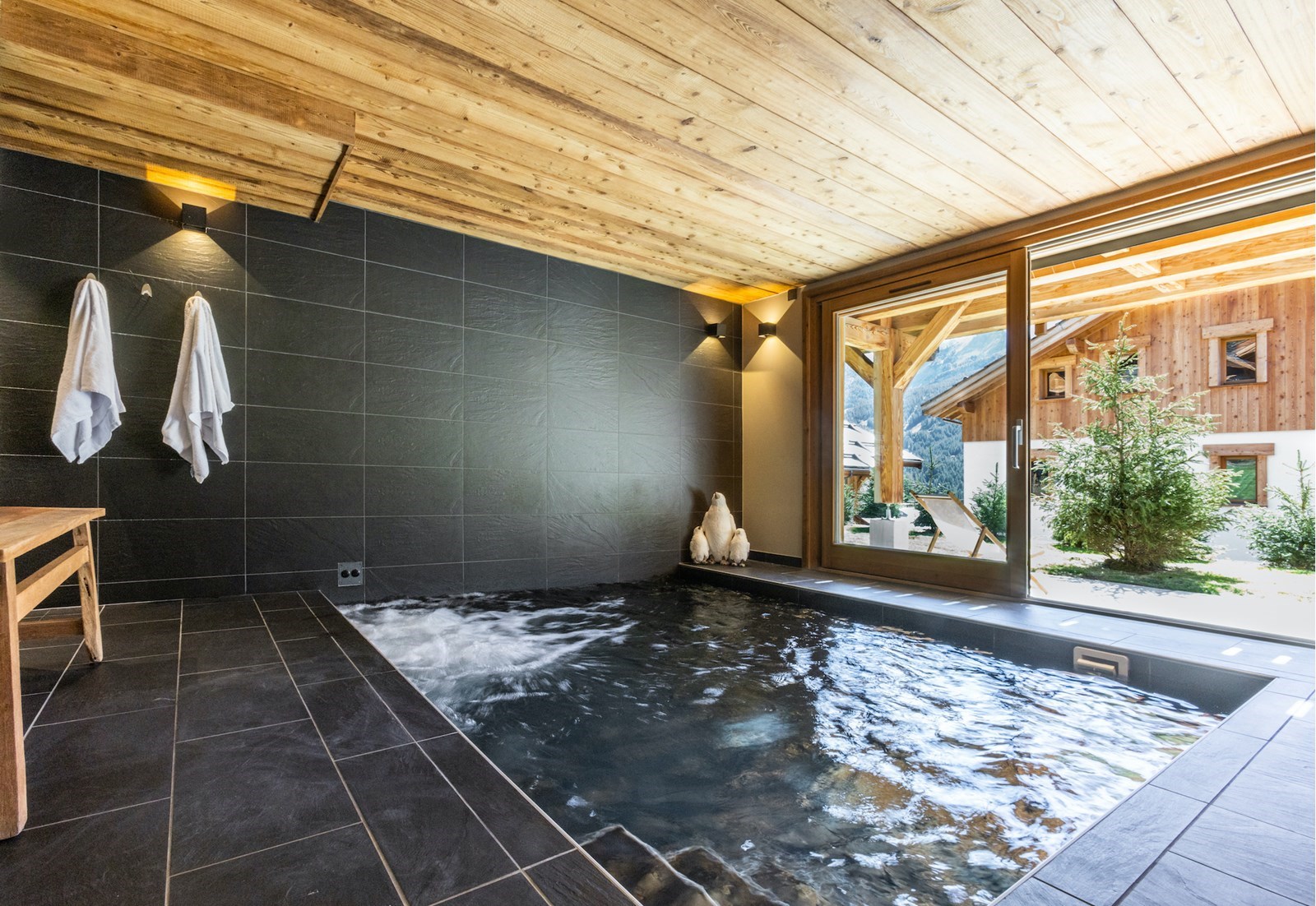 Face à la montagne, il devient une invitation irrésistible à la relaxation. L'eau chaude, la vue infinie, le corps qui se relâche : la trilogie gagnante.